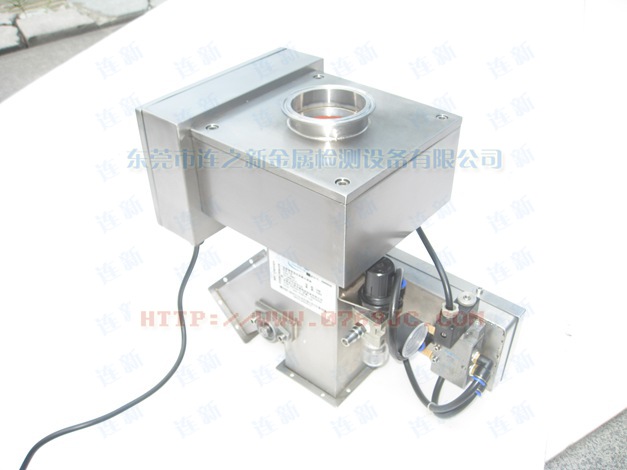 原料從料斗或送料器自由下落進(jìn)入金屬分離器,如果沒有金屬雜質(zhì),原料會直接通過金屬分離器流向下端的出料口。如果檢測器檢測到原料中含有金屬,那么控制器立刻啟動分離板將金屬物和部分原料一起導(dǎo)向側(cè)面的排料口,然后分流板迅速恢復(fù)至正常的位置,分流板速度可調(diào),金屬分離器的檢測精度也可根據(jù)生產(chǎn)需要調(diào)節(jié),最小可檢測并分離出Φ 0.2mm的金屬顆粒。